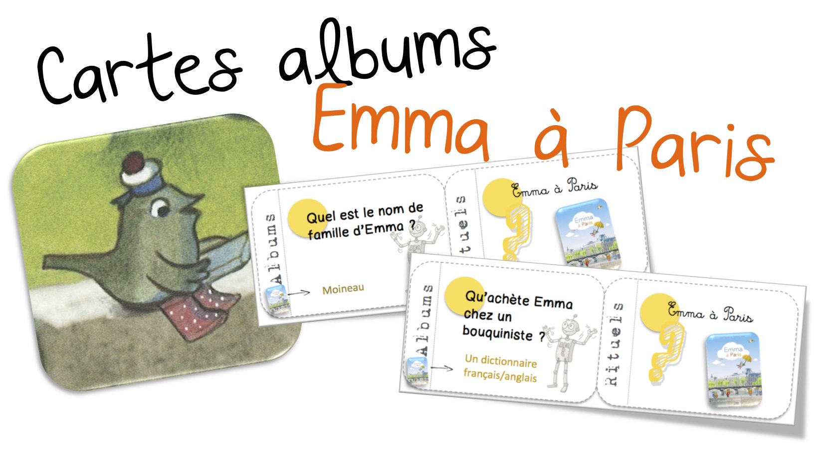 • MILLE MERCIS pour ce travail sur Emma. Je vais l’utiliser en période 5 avec mes CP CE1. Mais comme mes CE1 sont plutôt bons lecteurs je leur proposerai en plus des textes documentaires sur chaque monument ou lieu dont il est fait mention dans l’album : La Seine, l’Arc de Triomphe, les villes qu’a visité Amélie, Notre-Dame et la Tour Eiffel. Ces documents seraient-ils utiles dans ton blog ? Je peux te les envoyer…