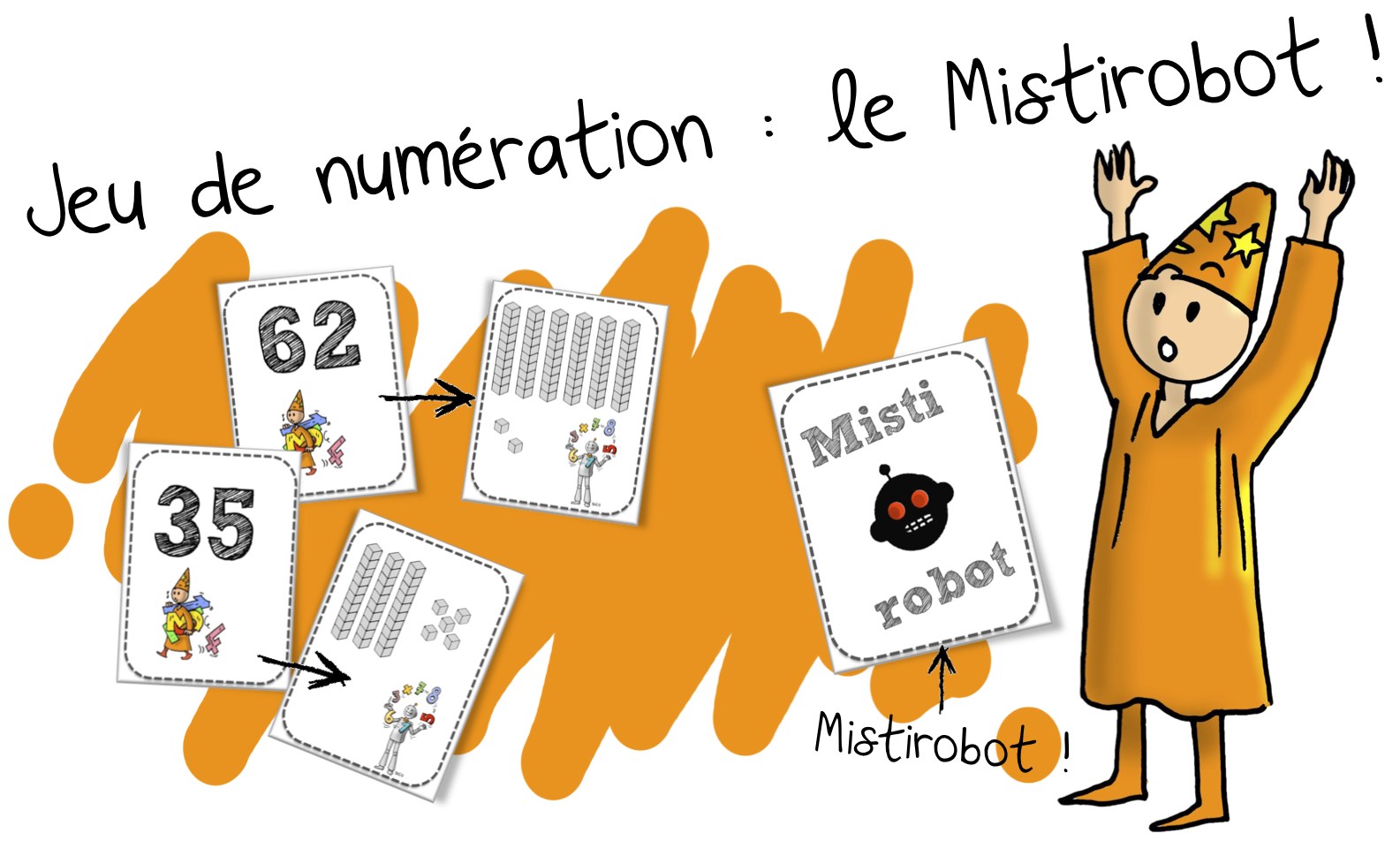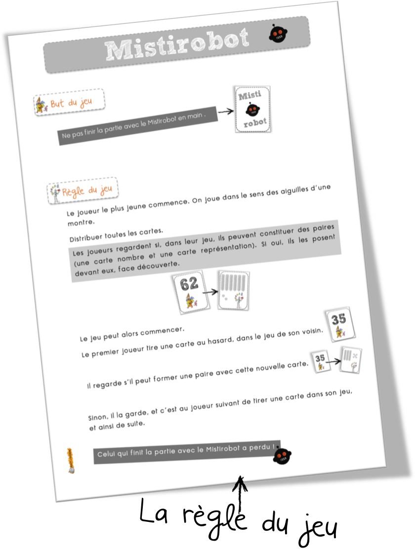 Les élèves doivent associer les cartes par paire . ( Nombre et représentation ) L’enfant qui n’a plus que le Mistirobot a perdu .Vous trouverez dans ce dossier les cartes , le verso à coller à l’arrière et la règle du jeu .