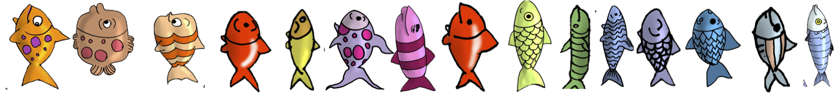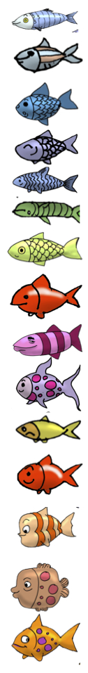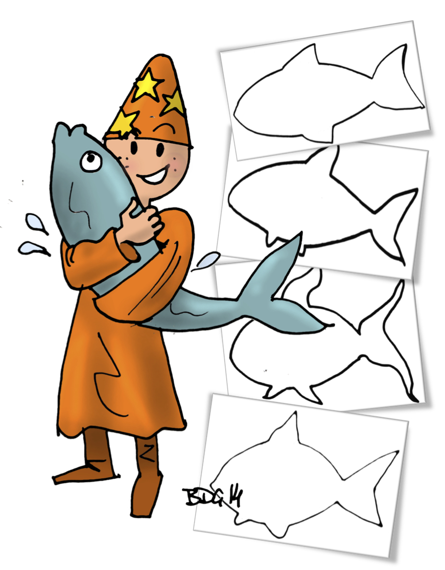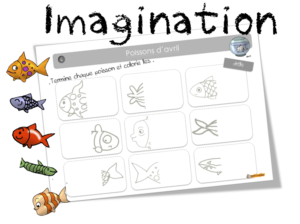 Dessiner la queue ou la tête du poisson . Il y a deux fiches , on peut même découper l’avant d’un poisson d’un élève et l’arrière du même poisson d’un autre élève et les recoller ensemble …