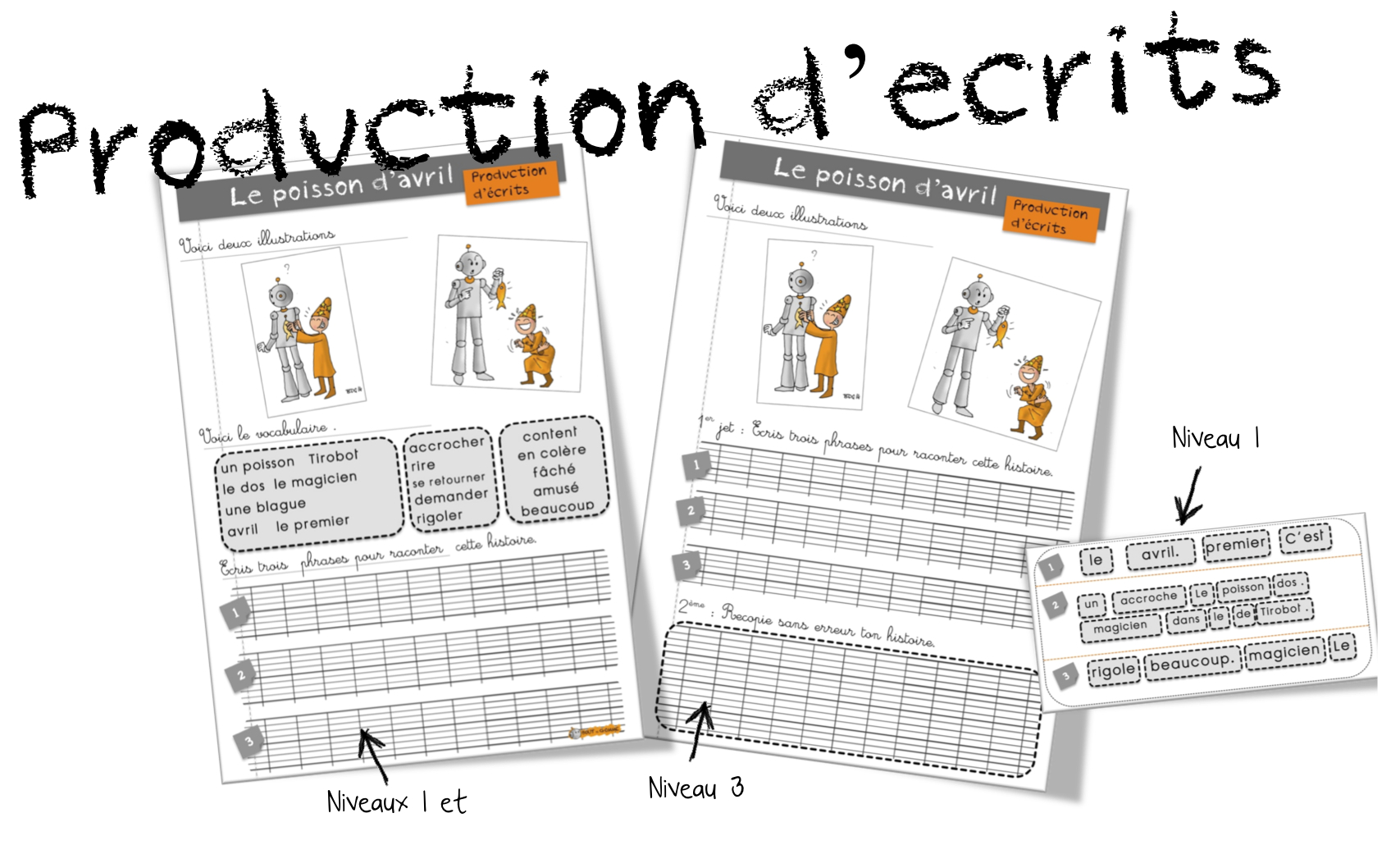 petit retour sur la production d’écrit hier. J’ai utilisé les fiches en 4 niveaux dans ma classe de CP: 2 avec l’histoire à faire sur le cahier d’ essai 7 avec les 3 phrases à faire seuls 6 avec les mots en aide pour faire les phrases Et 5 avec les phrases à reconstituer à l’aide des étiquettes C’était TOP pour une première! Merci encore! A refaire encore et encore….