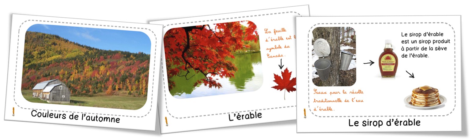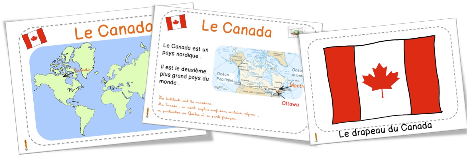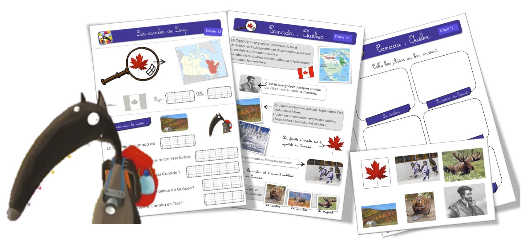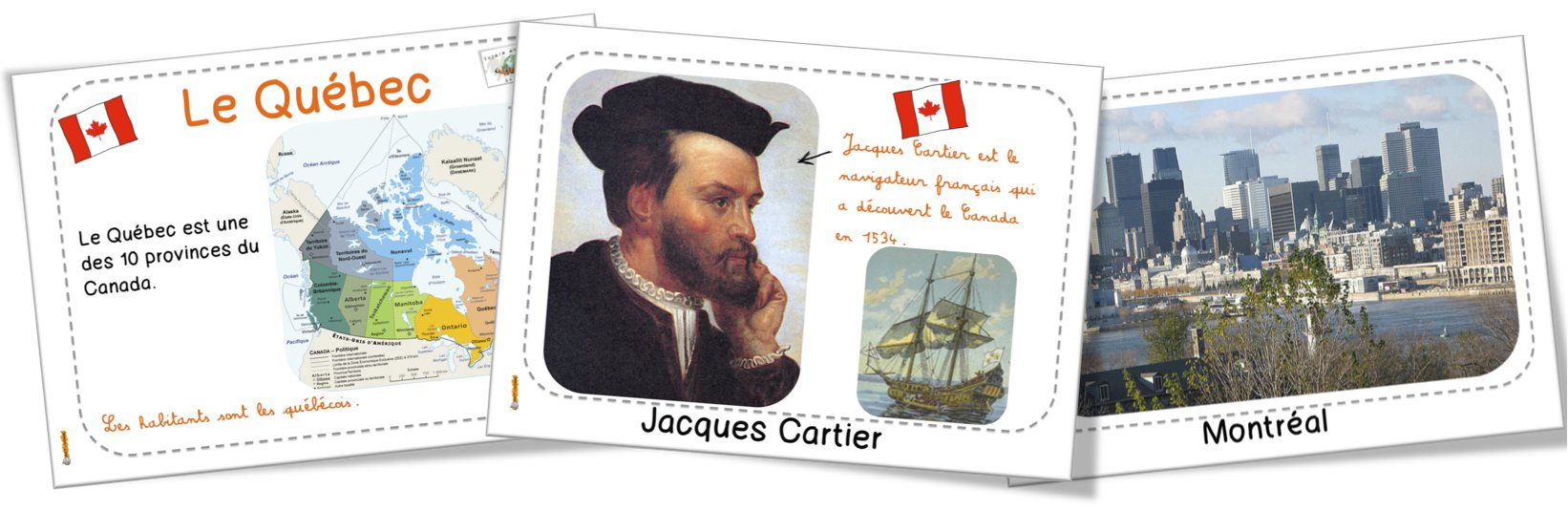 On y trouvera donc la carte du monde, du Canada et de ses 10 provinces dont le Québec , le drapeau , l’hiver au Canada, les symboles du Canada : la feuille d’érable et le castor , le sport national : le hockey sur glace , Jacques Cartier ( le navigateur qui a découvert le Canada) …toutes ces fiches sont simplifiées pour que les élèves de CP et CE1 en retiennent le principal ….