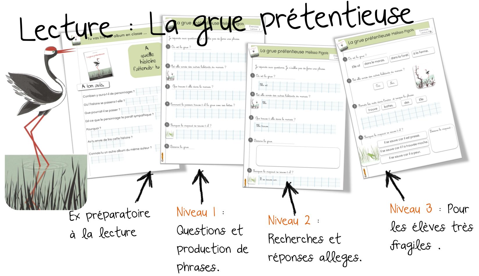 Une belle exploitation de La grue prétentieuse de Melissa Pigois pour les CP-CE1 .