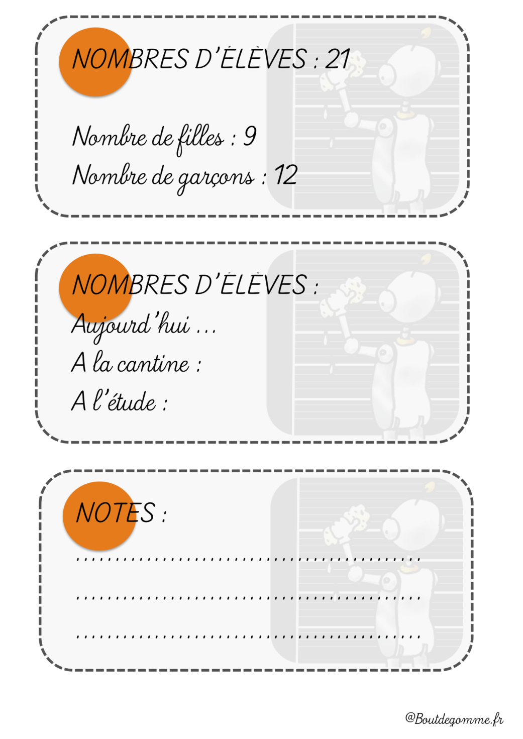 Je l’accroche à ma porte de classe et j’en mets une copie dans mon cahier journal (ainsi qu’une copie par ordre de naissance ). Je plastifie ces 2 fiches et je peux écrire dessus avec mes feutres velleda magiques : j’en parle ici. Vous pouvez aussi le faire avec les Woody ( j’aime moins et pourtant efficaces aussi ). C’est un outil ( obligatoire pour la liste) très utile au moment de chaque sortie de classe à 11H30 et à 16H30. Je vous poste donc cet outil en word …. Mes élèves font l’appel le matin avec des étiquettes qu’ils ont collées au blu-tack sur une affiche « cantine et étude » . ( elle est ici mais je vais en refaire une prochainement ). J’ai donc le nom de chaque élève sur cette affiche . Les élèves de cantine se mettent toujours devant mon rang …je n’ai donc qu’à regarder le mémento accroché à la porte , compter , et laisser partir ce groupe à la cantine au bon moment . Le soir , c’est pareil pour l’étude … Je vais ajouter une ligne : bouquet d’activité : activités mises en place par la mairie à 16H30. La petite case « Notes » est pour tous ceux qui veulent y laisser un message : mes collègues, moi, la dame de cantine …même si la porte est fermée … |