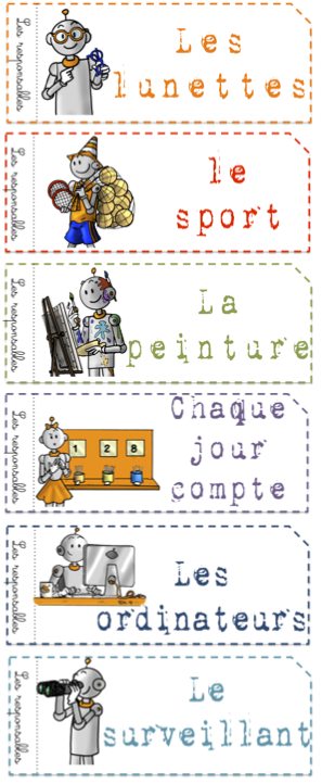 Merci pour tes petits robots. Je modernise dès demain mon tableau de responsabiltés. Dans ma classe, j’ai aussi un reponsable des casiers qui vérifie, à la récréation, que les bureaux des élèves soient bien rangés afin qu’aucune feuille ne traine (ce qui n’est pas rare, juste avant la récréation…la priorité étant de SORTIR !!). Il appelle alors ses camarades qui doivent alors mettre de l’ordre dans leurs affaires. Alors si l’inspiration te vient pour un petit robot et que cela serve à d’autres…