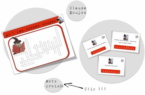 Voici un super « mots croisés » sur « Ah! Les bonnes soupes » de Claude Boujon . Je travaille dessus depuis la rentrée de la Toussaint en lecture suivie . Les élèves adorent cet album et moi , bizarrement , je ne m’en lasse pas !!!! Coralie m’a donc fait , rien que pour mes petits élèves, et les vôtres aussi bien sûr !!! , ces mots croisés ! Merci Coralie ! Coralie est devenue une spécialiste des mots croisés sur mes trames !!! J’en ai encore 5 ou 6 à vous faire découvrir ! |