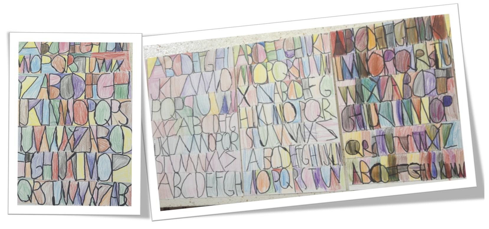 Avec des feuilles canson blanche , nous avons fait tracé des traits à la règle puis tracer les lettres de l’alphabet ou les lettres de son prénom . Puis coloriage aux crayonx de couleur pour certains et aux feutres pour d’autres . Ils repassent ensuite les lettres aux feutres noirs ( et je teste en ce moment avec de la craie grasse noire ) Avec des couleurs chaudes ou des couleurs froides …etc …pas mal de consignes à proposer en fonction de vos objectifs .
