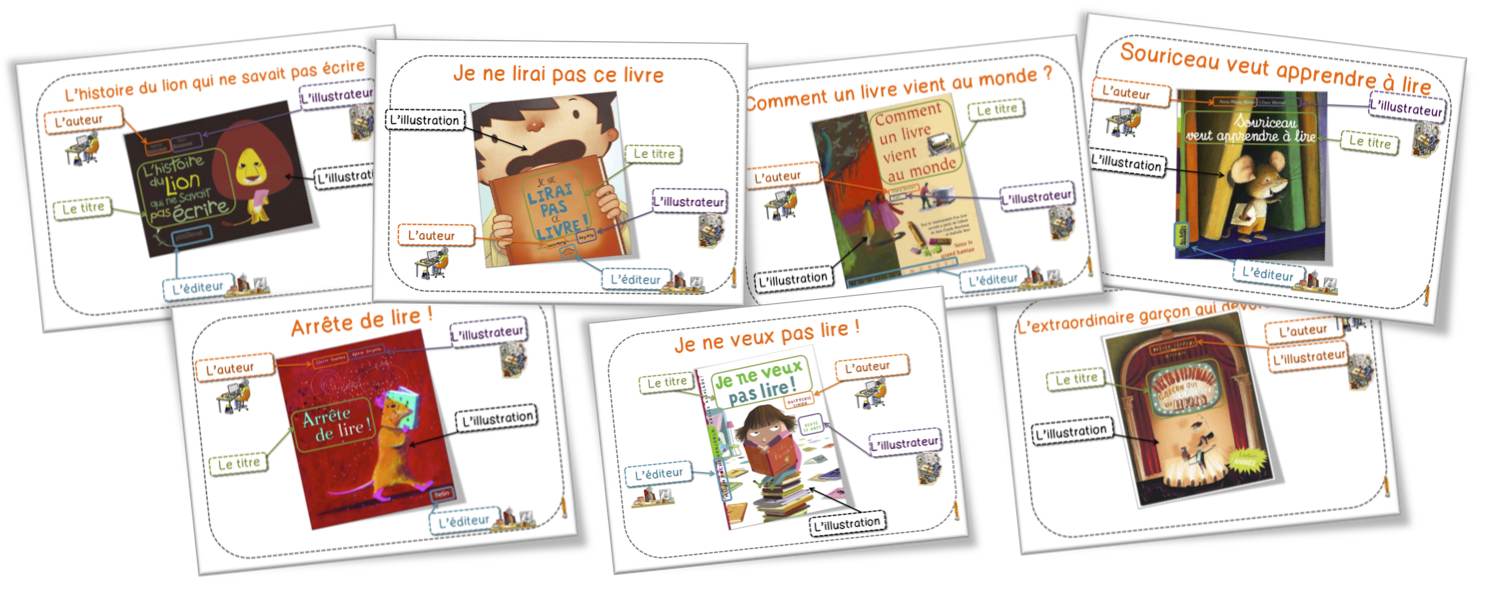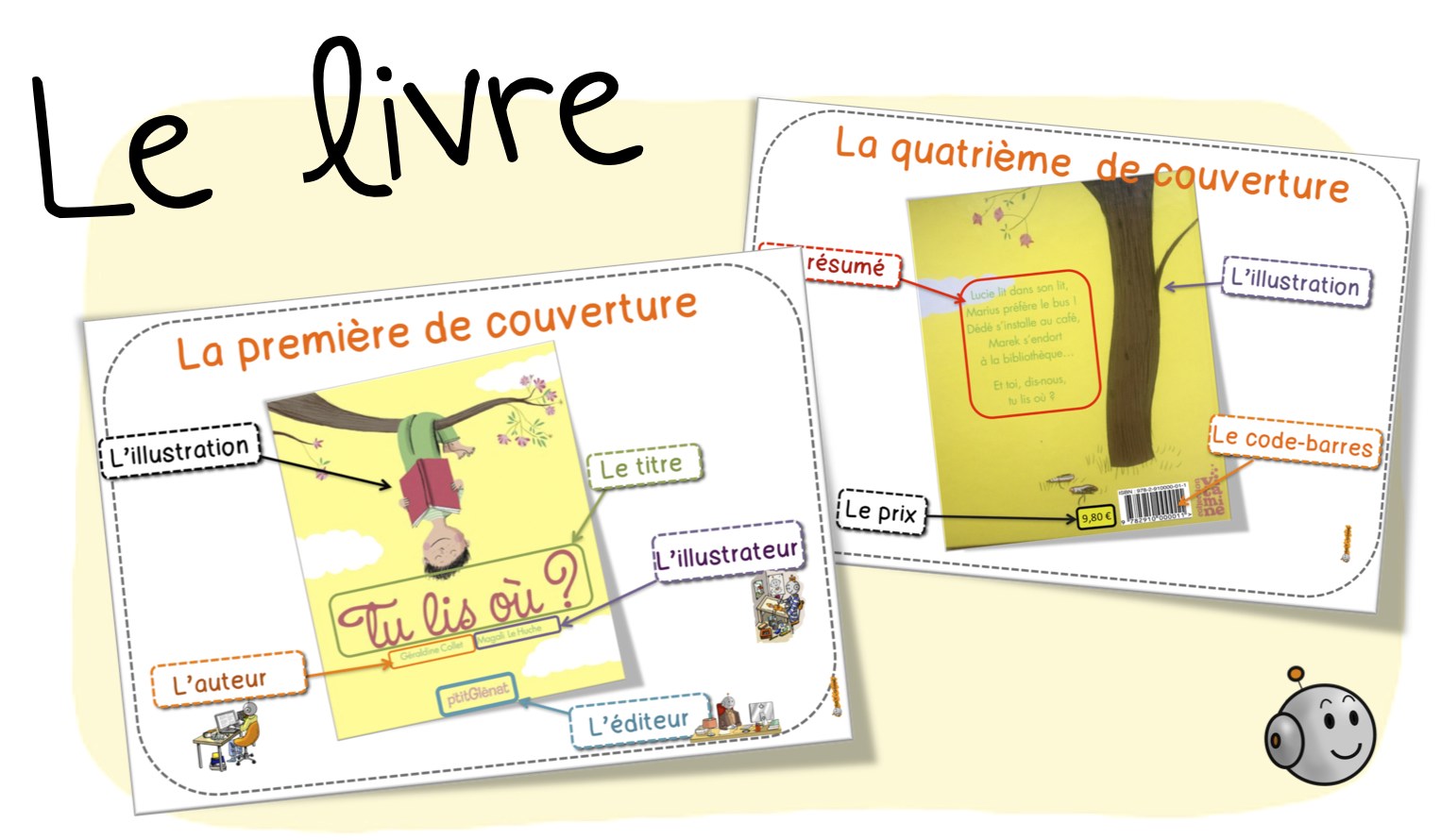 L’article sur les différentes parties du livres ( Première de couverture , quatrième, dos, titre, illustration, illustrateur…etc ) : ici